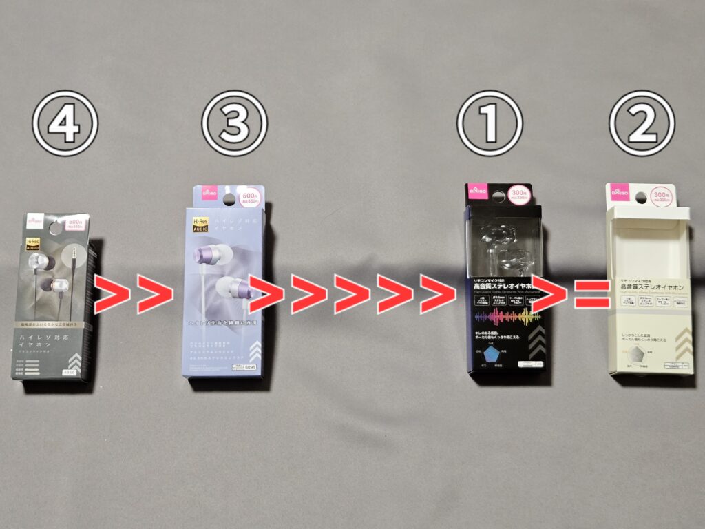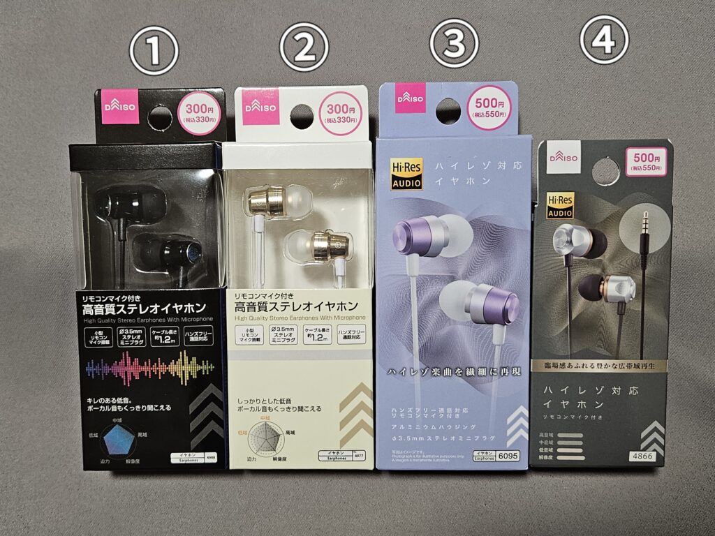 比較対象:ダイソーのハイレゾ・高音質有線イヤホン4機種