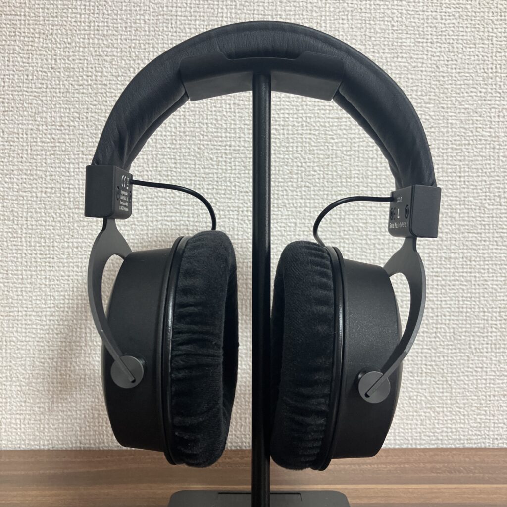 イヤーパッドはbeyerdynamicおなじみのベロア素材。肌触りがやわらかくて、長時間つけてても蒸れにくいのが嬉しいところ。DTMやミックス作業で何時間使っても、耳が痛くなりにくいのは助かります。
